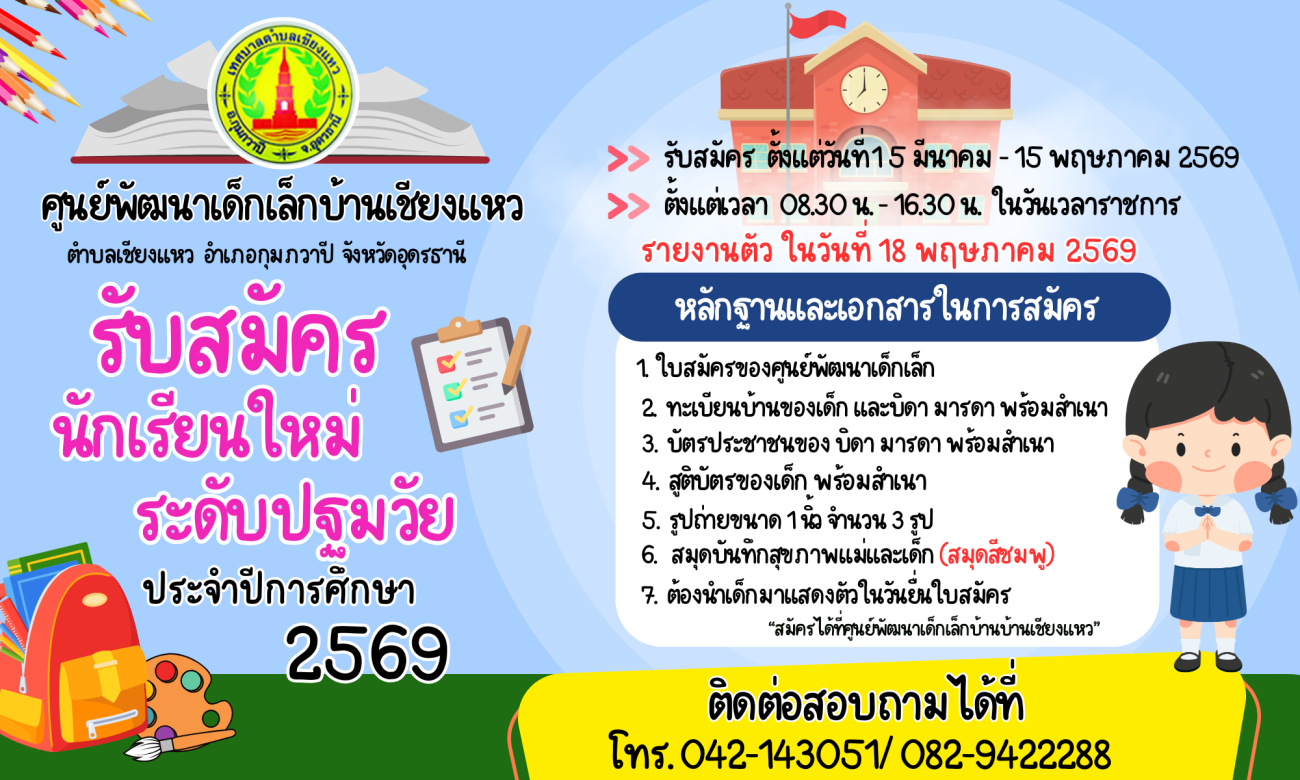 ประชาสัมพันธ์ ศูนย์พัฒนาเด็กเล็กสังกัดเทศบาลตำบลเชียงแหว เปิดรับสมัครเด็กใหม่ ระดับก่อนปฐมวัย ประจำปีการศึกษา 2569